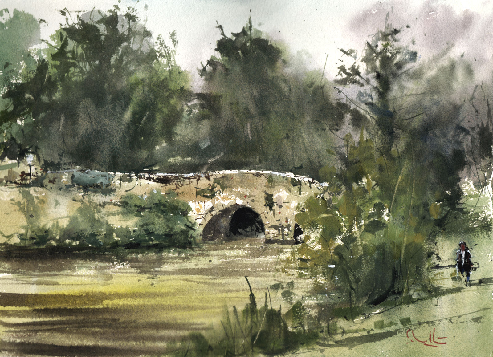 Argenton Bridge is an original watercolour painting by Robert Scholten, created on location in the serene riverside town of Argenton. This piece captures a quiet moment along the river — sunlight filtering through dense green foliage, soft reflections on the water, and the timeless stone bridge arching gracefully over the stream.