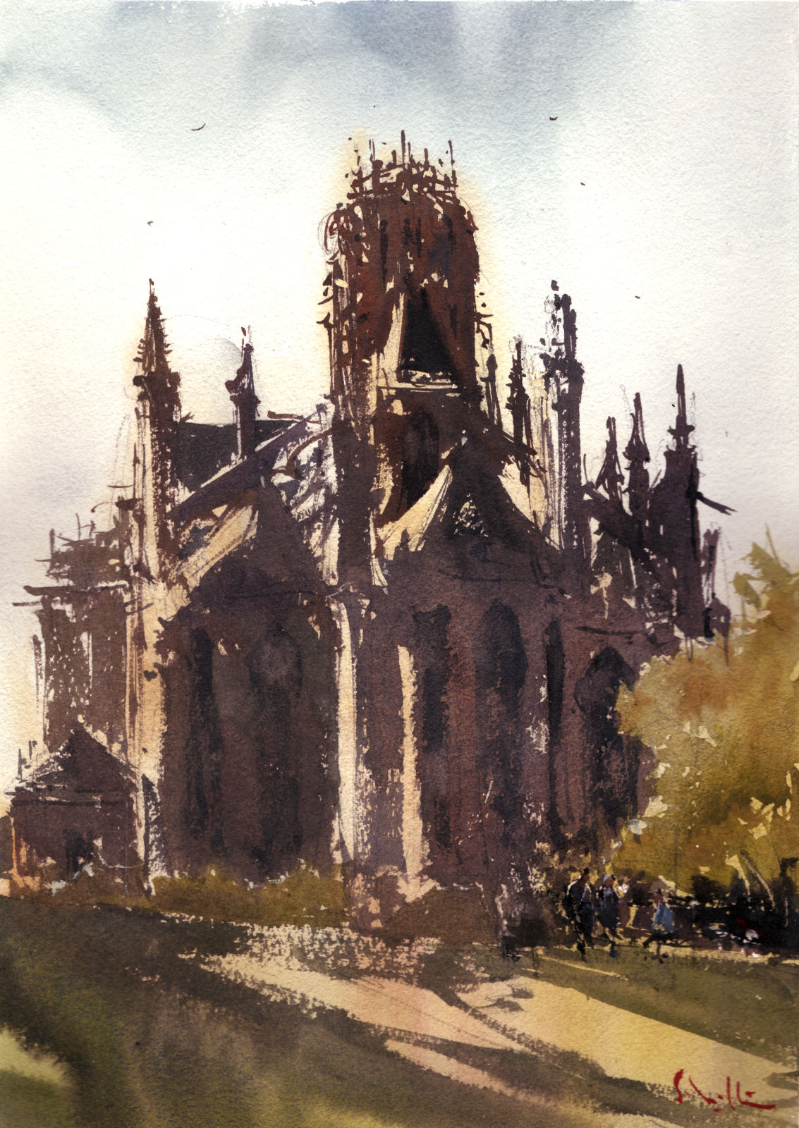 Rouen Cathedral is an original watercolour painting by Robert Scholten, capturing the luminous architecture of Rouen’s Gothic cathedral in rich golden tones. Painted on location and refined in the studio, the piece evokes both the monumentality of the structure and the fleeting warmth of sunlight across its façade.